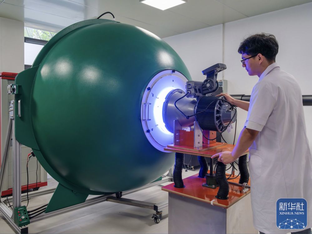 ↑ 工程师在上海赛倍明照明科技有限公司的研发中心对研制的体育照明灯具进行光学色品检查(5月8日摄)。该公司集照明与物联网、人工智能等技术于一体,为体育赛事专业照明、新一代智慧型全民健身场馆照明等场景提供电气设计、智能控制、工程安装、系统调试等线上和线下解决方案。新华社发