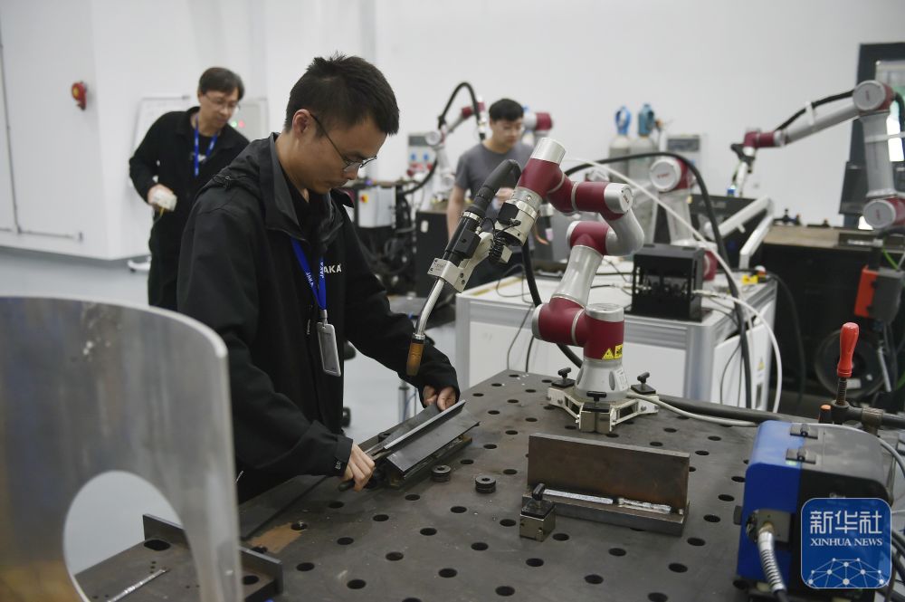 ↑ 技术人员在上海节卡机器人股份有限公司的性能测试区调试焊接机器人(4月24日摄)兴旺国际投资。新华社记者鲁鹏摄