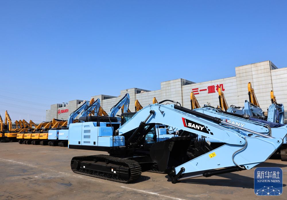 ↑ 这是上海三一重机股份有限公司内等待装运的挖掘机产品。蓝色车型为出口海外的纯电挖掘机产品(4月15日摄)。新华社记者方喆摄