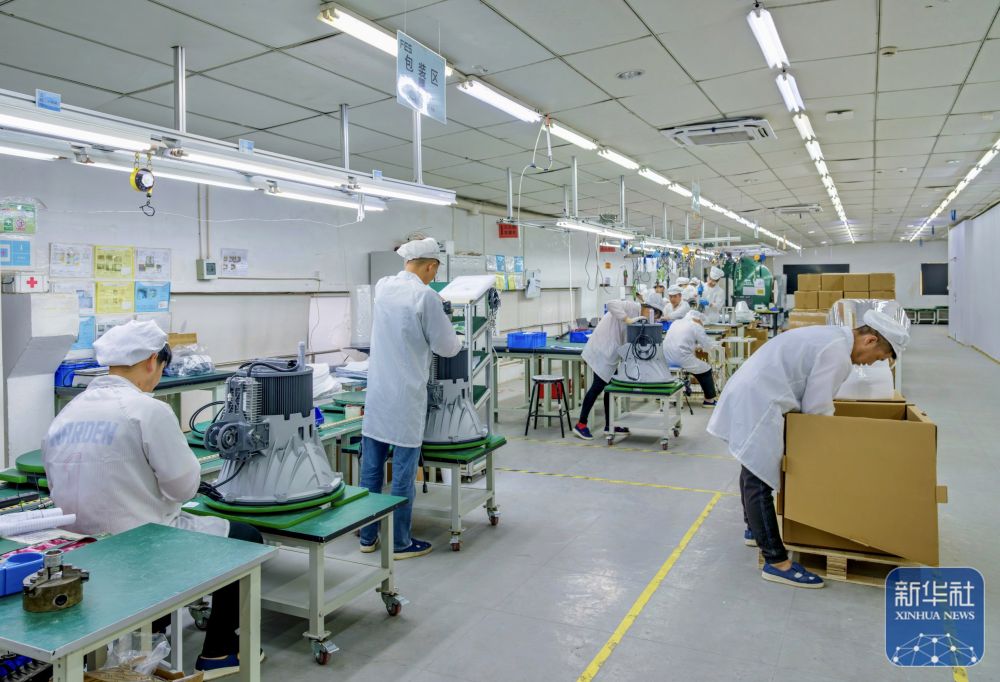 ↑ 工作人员在上海赛倍明照明科技有限公司的生产车间组装定制的赛事和娱乐一体式灯具(5月8日摄)。新华社发