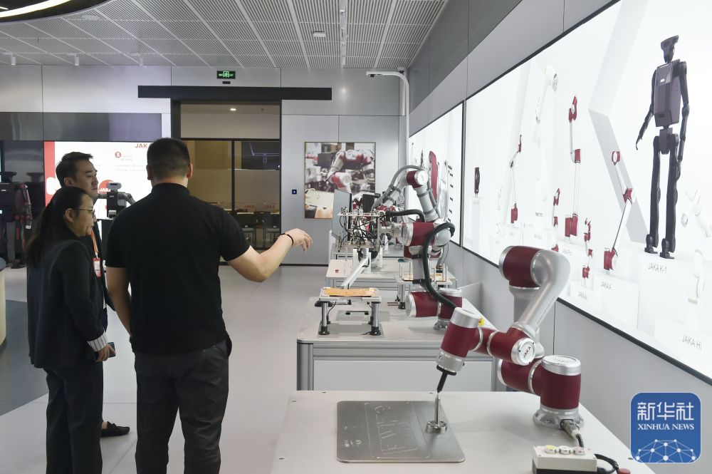↑ 来访者在上海节卡机器人股份有限公司的产品展示厅参观展出的机器人(4月24日摄)。新华社记者鲁鹏摄