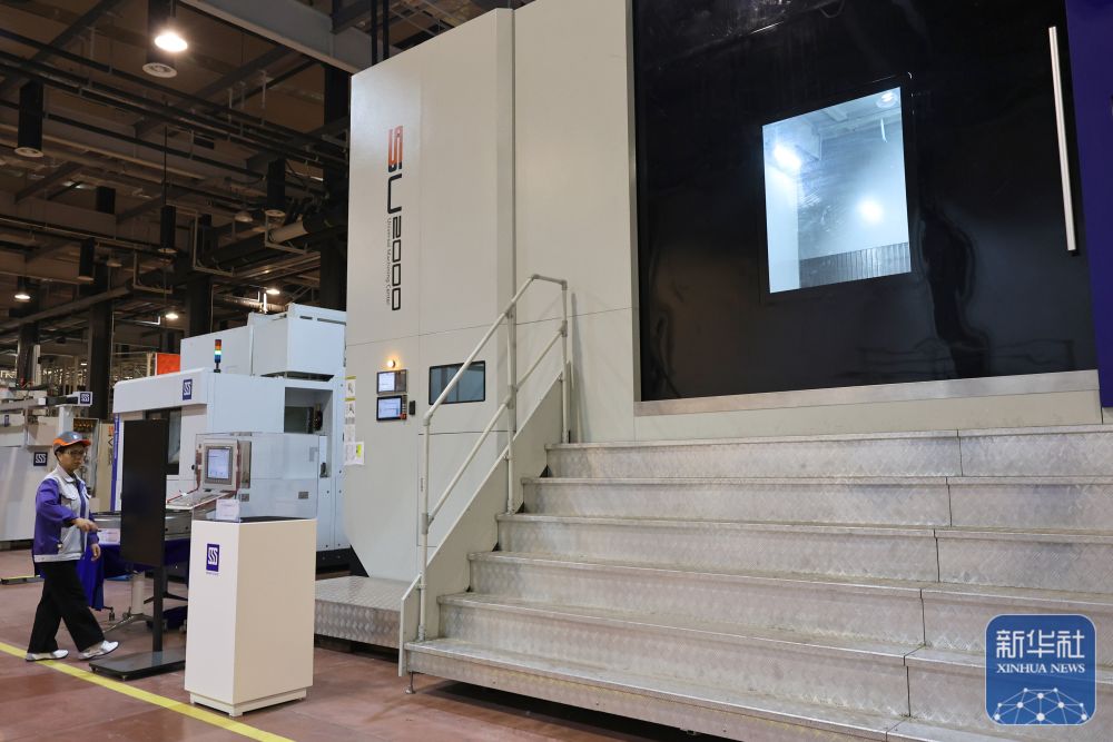 ↑ 技术人员在上海交大智邦工业母机与智能制造共性技术中试验证基地内工作(4月15日摄)。该公司起源于上海交通大学,是一家高端装备与工业软件制造与集成服务商,已有员工约200人,研发人员占比超50%。公司通过建成国家首个汽车动力总成装备中试验证基地、航发装备工艺验证“先行先试”专项以及各类尖端镗铣及五轴加工中心的研制,实现了用户端的示范应用以及市场化推广。新华社记者方喆摄