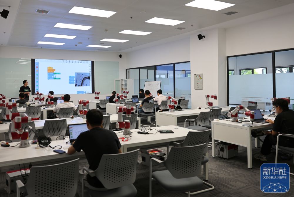 ↑ 工作人员在上海节卡机器人股份有限公司的培训教室内为客户进行机器人使用教学(4月24日摄)。新华社记者方喆摄