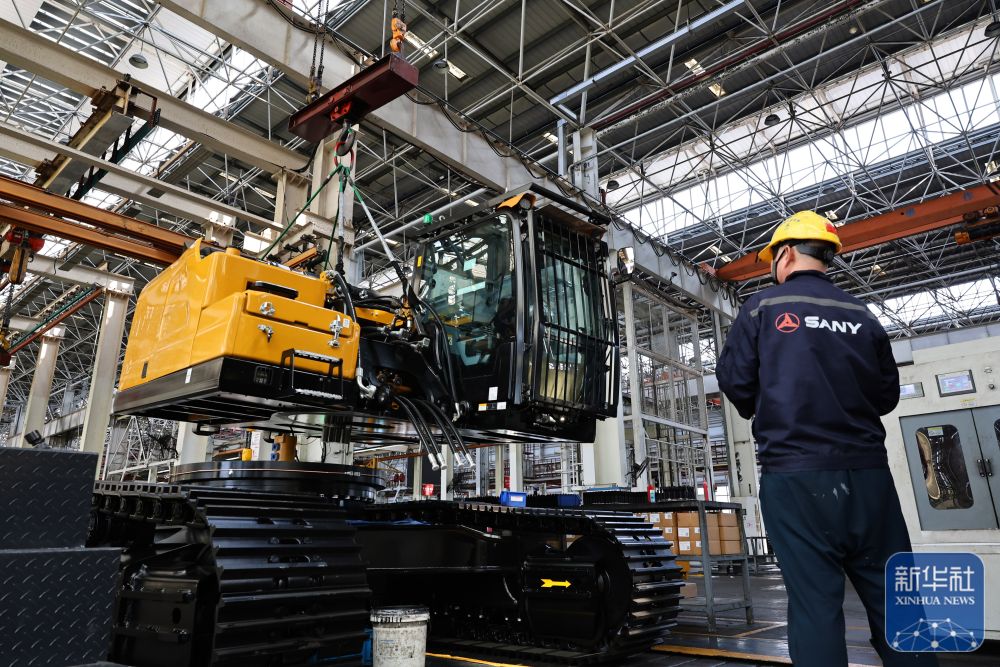↑ 工人在上海三一重机股份有限公司产线上工作(4月15日摄)。新华社记者方喆摄