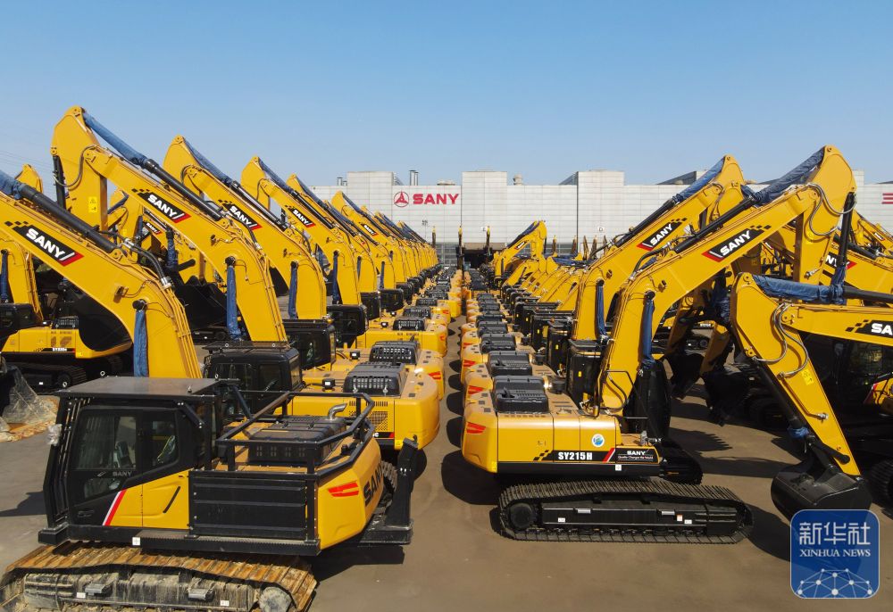 ↑ 这是上海三一重机股份有限公司内等待装运的挖掘机产品(4月15日摄)。新华社记者方喆摄