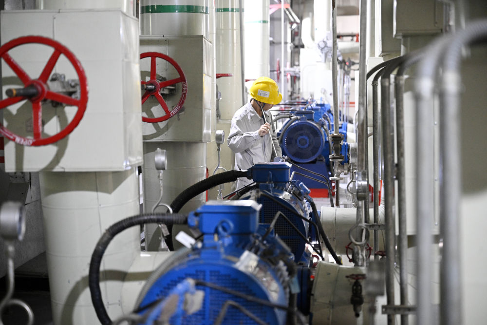 2024年11月12日,国家能源集团宁夏灵武电厂工作人员在供暖设备机房对设备进行巡查。新华社记者王鹏摄
