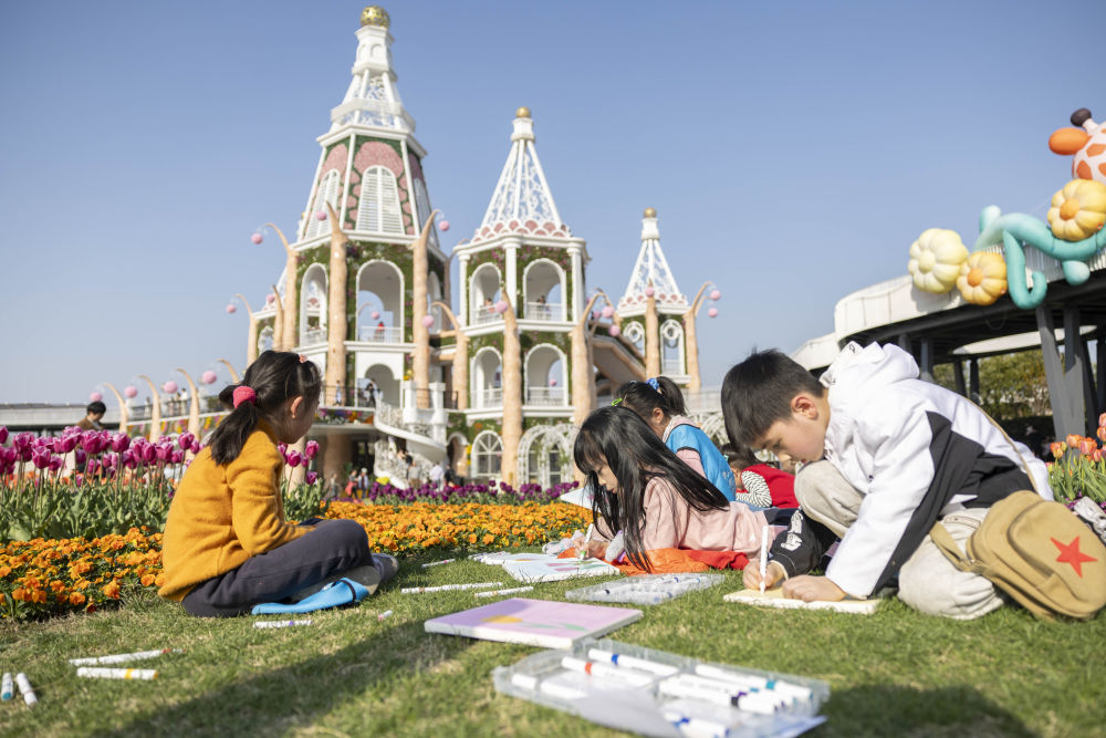 3月22日,小朋友在上海浦江郊野公园奇迹花园草坪上绘制鲜花。新华社记者王翔摄